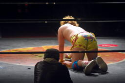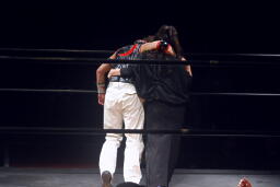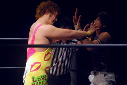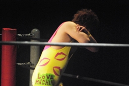 勝って風間も取り返したか、と思ったが、風間は福田の反則が気に入らなかったのか、もうすっかり福田からは気持ちが離れたのか凛音に肩を貸して花道を帰る(右写真)。