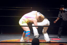 凛音がフィッシャーマンズスープレックス狙う、福田ブロック(左写真)。