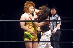ロープワーク、凛音アームドラッグ(右写真)連発からドロップキック。ダウンした福田にストンピング、サッカーボールキック。