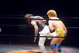 ヒザ蹴り、ロープに振ってドロップキック(左写真)、カウントは1。福田場外エスケープ