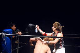 背後から凛音がコールドスプレー、福田かわしてスプレーは風間の顔面に(左写真)。風間場外転落。