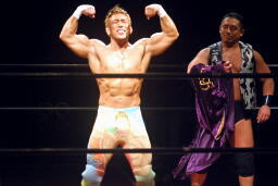 新松田「次はシングルだ!」(左写真)しかしスーザン代表が次回大会4/8を提案すると「新木場は小さすぎる」と拒否、強引に5/4後楽園でのシングルを決定。
