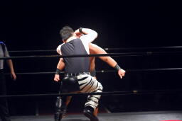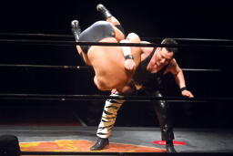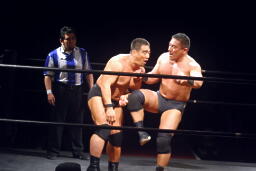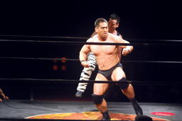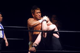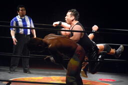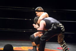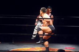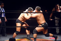 先発は新高木と義也。ロックアップ、新高木ヘッドロック(左写真)、義也ロープに振る、新高木ショルダーブロック。