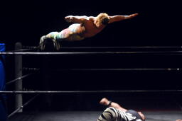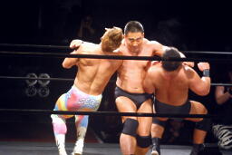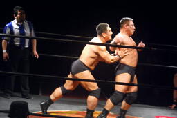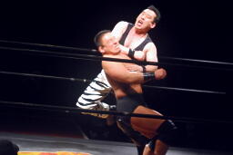 ロックアップ。どっちかが高木でどっちかが松田(右写真)。互いにロープに押し込み合うが両者ともクリーンブレーク。