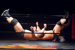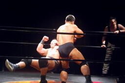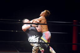 新高木がロープに固定してヒップドロップ、ルードがDDT(右写真)、新高木にタッチ。5分経過。