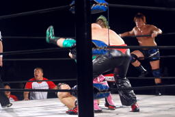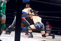 石川コーナーに振って突っ込む、忍カウンターのキック、忍突っ込む、石川キャッチしてブレーンバスター狙うが忍切り返して不安定ながら逆に投げる。義人にタッチ。義人担ごうとするが石川ブロック。入江を呼び込んでダブルのクローズライン、義人かわして2人にスピアー(右写真)。