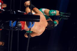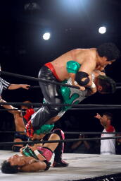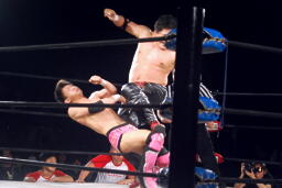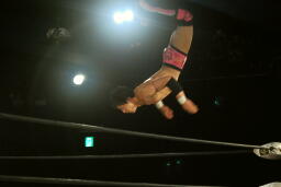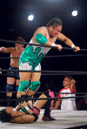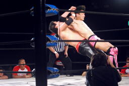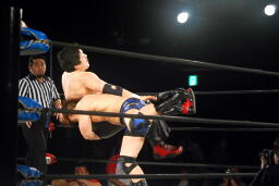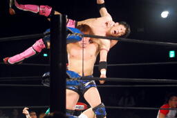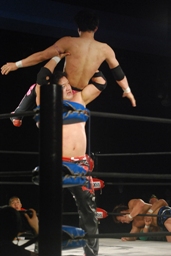 石川も乗る(右写真)。入江のノドがトップロープに引っかかり、石川の重みで入江の首が締まる。酷いタッグパートナーだ。入江と石川ダブルのショルダーブロック。
