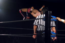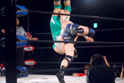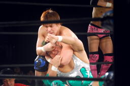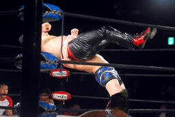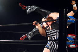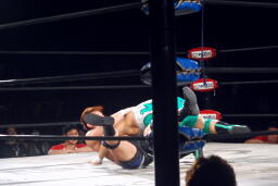 忍ストンピング、入江立ち上がってエルボーの打ち合い、忍エルボー連打、ロープに飛ぶ、入江キャッチしてパワースラム(右写真)、石川にタッチ。