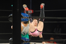 石川ボディスラム、カバー、カウント1。忍チョップ、石川ニーリフト、入江にタッチ。入江首投げ、上に乗る(左写真)。
