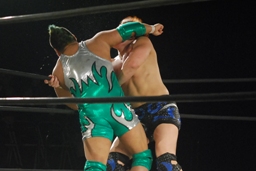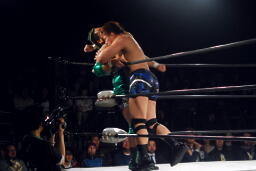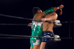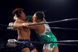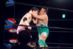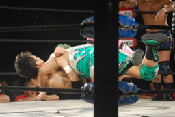 ロックアップ(左写真)、石川がロープに押し込む、ブレーク。再度ロックアップ、義人ヘッドロック。石川がロープに振ってショルダーブロックの打ち合い、石川の勝ち。