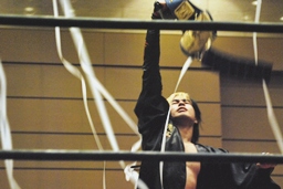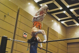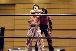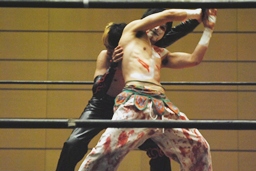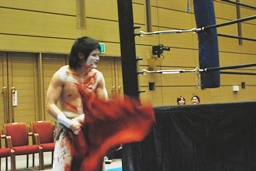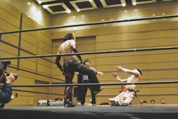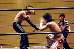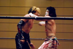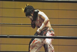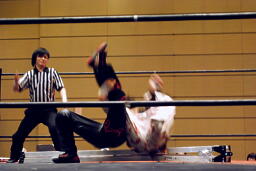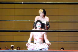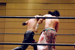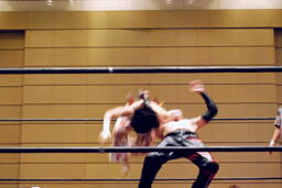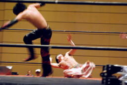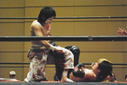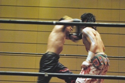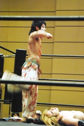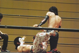 イサミパンチ(右写真)、ヒザを着いた小仲にバズソーキック、カウント2。イサミボディスラム、ラダーを立てて上る、小仲が浴びせ蹴りでラダーごと倒す。