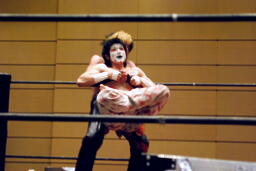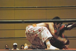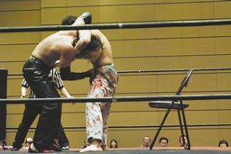 小仲ロープに飛ぶ、イサミキャッチしてスリーパー(右写真)、