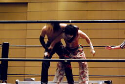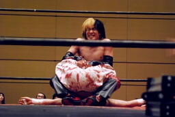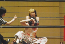 小仲はチンクラッシャーでイサミをイスに座らせると座禅式ダブルニーアタック(右写真)。5分経過。
