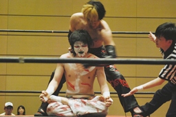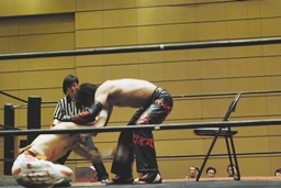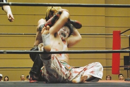 小仲エルボードロップからレッグロック。イサミ十字に切り返す、小仲エビ固めに(左写真)、カウントは入らず。