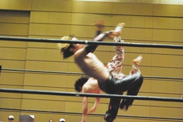 コーナーに上ると座禅式ダイビングダブルニードロップ(左写真)、イサミかわす。