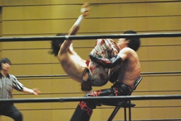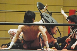 小仲はイスをセットしてブレーンバスター狙う(右写真)、イサミブロック。