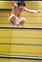 イサミ腕をひねる、小仲は座禅(右写真)。