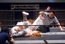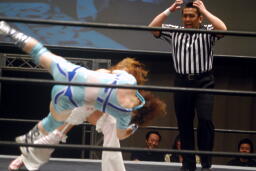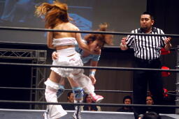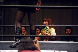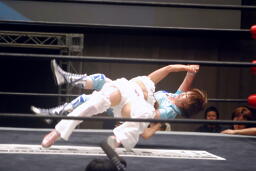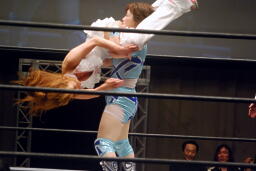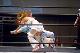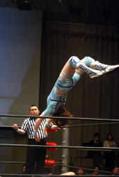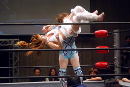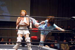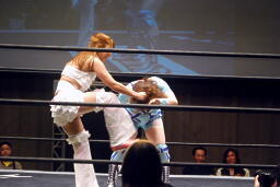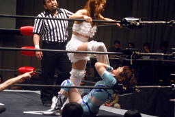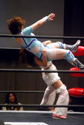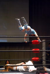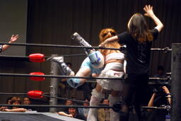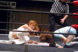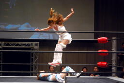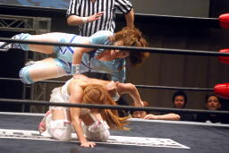 さくらが後ろ向きにコーナーに上る、チェリー捕まえてバックドロップに(右写真)。チェリー裏拳、カウント2。
