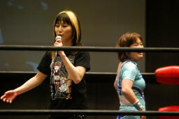 チェリーは夢をあきらめきれなくて普通では考えられない30歳でプロレスデビューしたこと、これからは同世代に夢を与える闘いをしていきたいことを語る(左写真)。