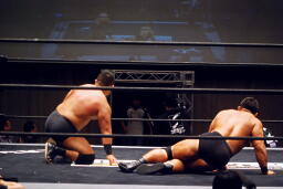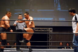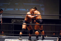 ようやくロックアップ、新高木ヘッドロック、新松田ロープに振ってショルダーブロックの打ち合い(左写真)。