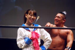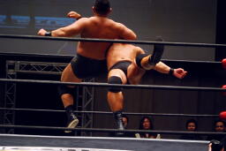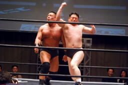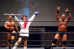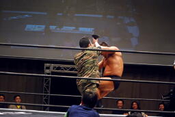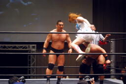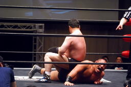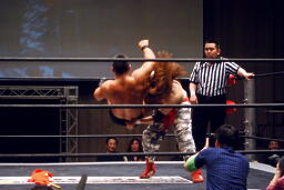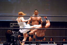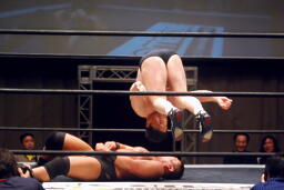 新高木のクローズラインをかわすとガットショットからオキャノンボム(右写真)、新松田カバー、カウント2。これで岡野は退場。