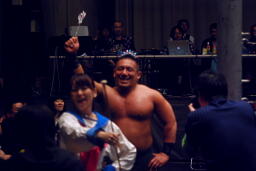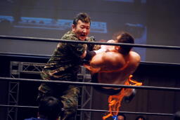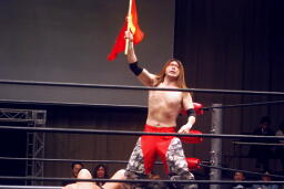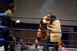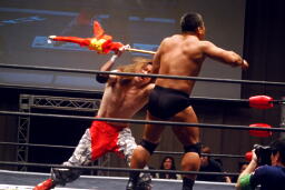2番目のウェポンは新高木側、元西日本プロレス、JET'S(実況の村田さんは「JET'Sは言っていいんですかね?」と妙に気を遣っていた)のホー・デス・ミン。フラッグで新松田を襲う(左写真)。