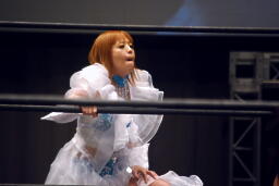 「Heaven Is the Place on Earth」が流れ市来貴代子が3番目のウェポンとして入場(左写真)。新松田側。さくらと市来が同日同会場にいたのか。
