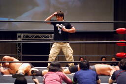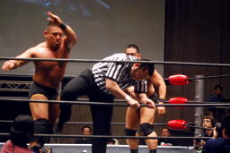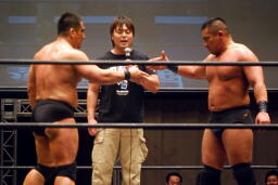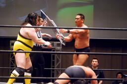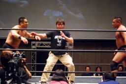 後藤が2人を押さえ込み松井レフェリーにカウント要求(左写真)、松井さん抗えずカウント3。