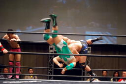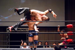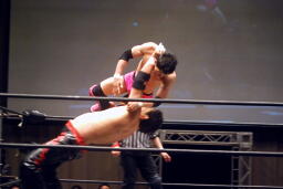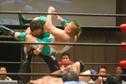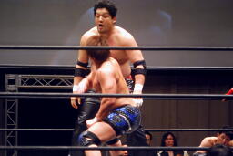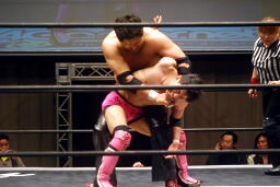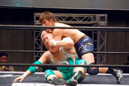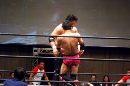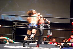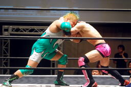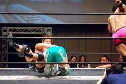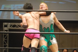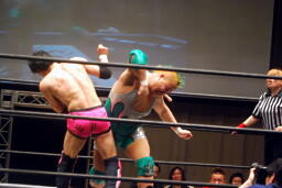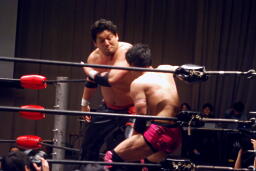 先発は忍と入江。ロックアップ(右写真)、入江がロープに押し込む、ブレーク。忍バック取る、入江腕をひねる、忍切り返しヘッドロックからフライングメイヤー、入江ヘッドシザーズでブレーク。両軍タッチ。
