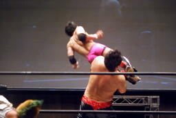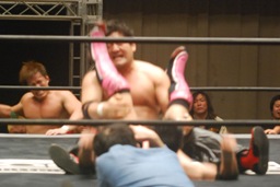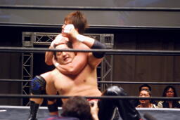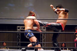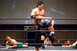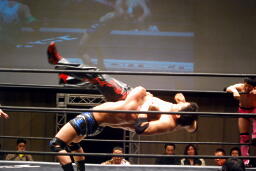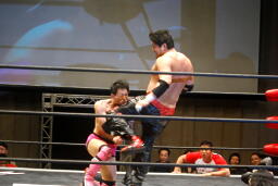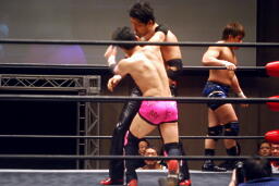 入江首投げから顔面ひねり。忍サミング、入江エルボー。義人入り入江を羽交い絞め、忍がパンチ、同士討ちではなく入江にヒットして驚く忍。王者組ダブルロープワーク、義人がDDTに。そして忍が顔面にドロップキック(左写真)、入江場外に。