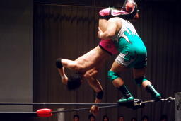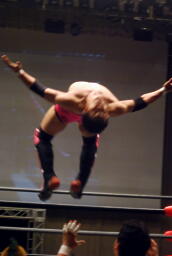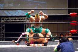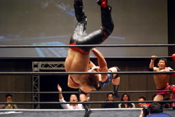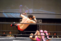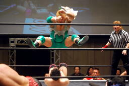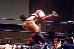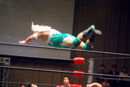 石川が入る。入江が振って石川ニーリフト、石川チョークスラム、入江がコーナーからダイビングボディプレス(右写真)、カバーは義人がカット。