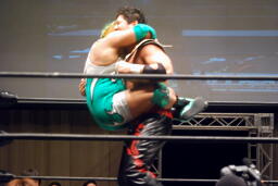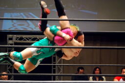 エルボーの打ち合い、忍ロープに飛ぶ、入江キャッチしてパワースラム(右写真)、石川にタッチ。