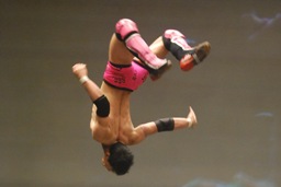 忍ケブラーダ(右写真)。場外でストンピング、リングに戻して義人にタッチ。5分経過。