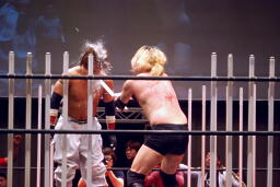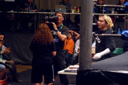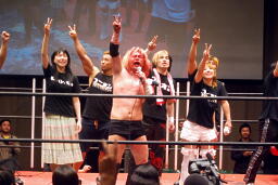 スーザン代表が「やりましょう。」と対抗戦を受諾(右写真)。ただ6月大会を予定している北沢タウンホールはデスマッチ不可のため7/18の新木場を会場に指定。