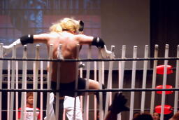 両者エプロンに着地してエルボーの打ち合い(右写真)。