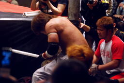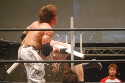 裕向蛍光灯の束を持つ、大家はそこ目がけて炎のスピアー2連発(左写真)。裕向場外に。