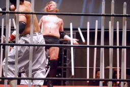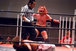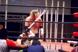 大家をコーナーに振り、蛍光灯の束を持って串刺しダブルニーアタック(右写真)。5分経過。