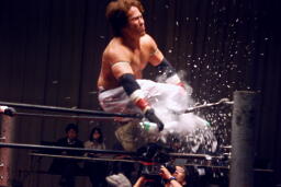 ぐったりとした裕向を大家は無理やり立たせ、ロープに振る、裕向はハンドスプリングエルボー(右写真)。