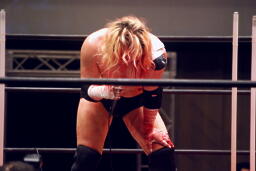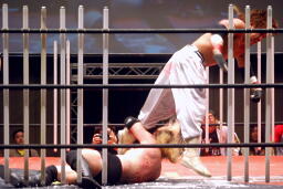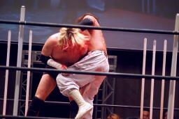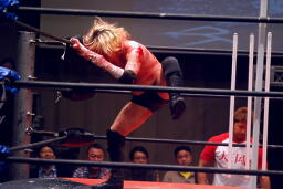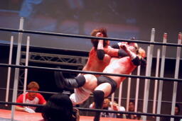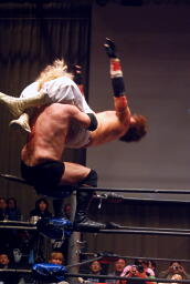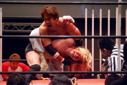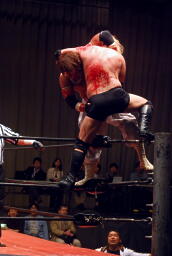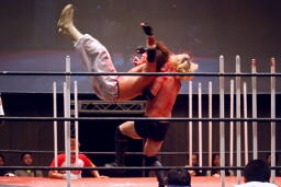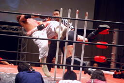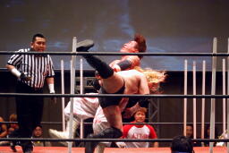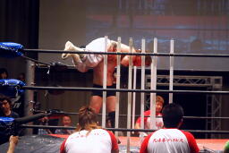 トップロープを挟んでブレーンバスターの掛け合いになるが(左写真)裕向はブロックして大家を突き落とす。