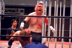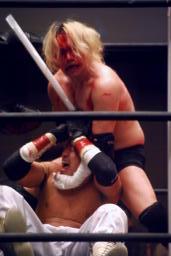 大家も蛍光灯で裕向を流血させる(左写真)。大家ナックル、足をロープに固定してドロップキック。