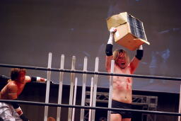 大家はリングを降りると売店から段ボール箱を持って来る(右写真)。