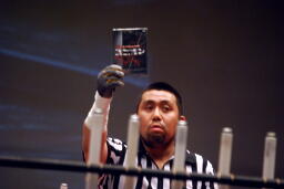今回登坂社長が来てないため、スーザンは李日韓に確認するが日韓「私には権限ないので・・・。」すると花道奥で見ていた伊東竜二が「本来なら会社に持ち帰らなければいけないが、時間がない、俺が決める。」とGOサイン。そしてデスマッチのできない6月北沢大会でのBJWタッグへの挑戦を受けるよう要求(左写真)。パートナーは翌5日に石川とデスマッチヘビー級を争うアブドーラ小林。