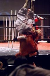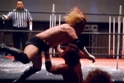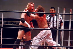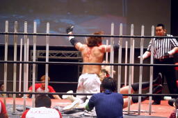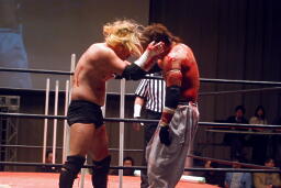 裕向は自分の頭で蛍光灯を割る。大家突っ込む、裕向カウンターのラリアット(左写真)、カウント2。
