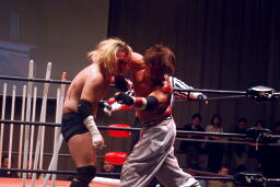 スタートはオーソドックスなロックアップからの腕の取り合い、裕向が大家をロープに振る、大家寸前でストップ。しかし二度目は止まれず蛍光灯に激突(左写真)。