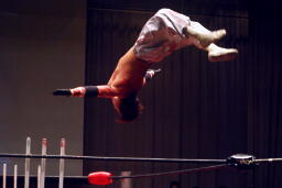 ボディスラムからコーナーに上ってムーンサルトプレス(右写真)、しかし両ヒザを打ったためカバーが遅れカウントは1。