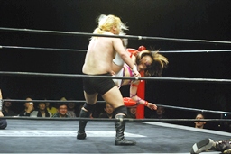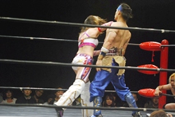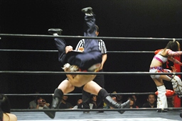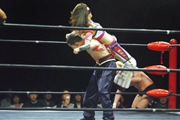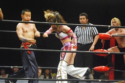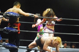 美央コーナーに振る、曹彰切り返して突っ込む、美央カウンターのキックからスイングDDT狙うが曹彰はブロックして投げ飛ばす(右写真)。