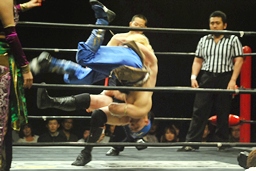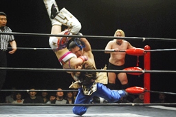 胴タックルから肩に乗せるとスピコリ・ドライバー(左写真)、カウント2。趙雲にタッチ。