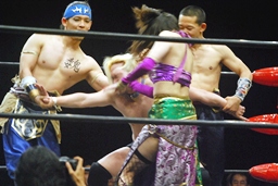 曹彰容赦なく張り手(右写真)、さらに美央がエルボー打つと「かーっ、ぺっ!」とツバ吐きかける。趙雲にタッチ。趙雲ボディスラム、曹彰にタッチ。