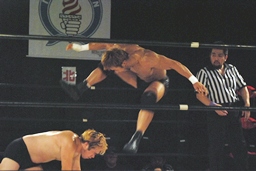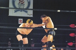 肩に担いでカミカゼ(左写真)、コーナーに上ってミサイルキック、諸橋スカす。