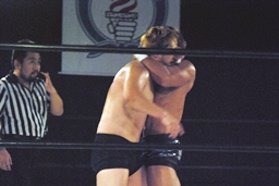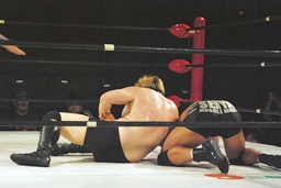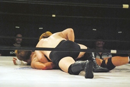 再度スリーパー(右写真)、頭にエルボースタッブ。ボディスラムからカバー、カウント2。